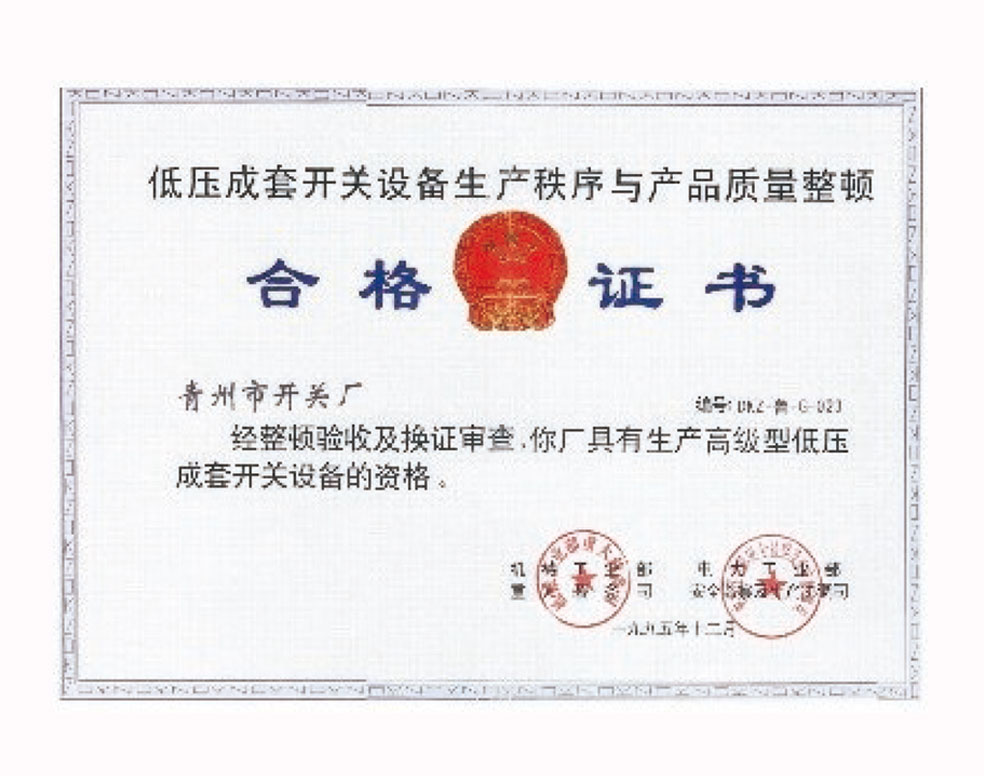 低壓成套開關(guān)設(shè)備生產(chǎn)秩序與產(chǎn)品質(zhì)量整頓合格證書